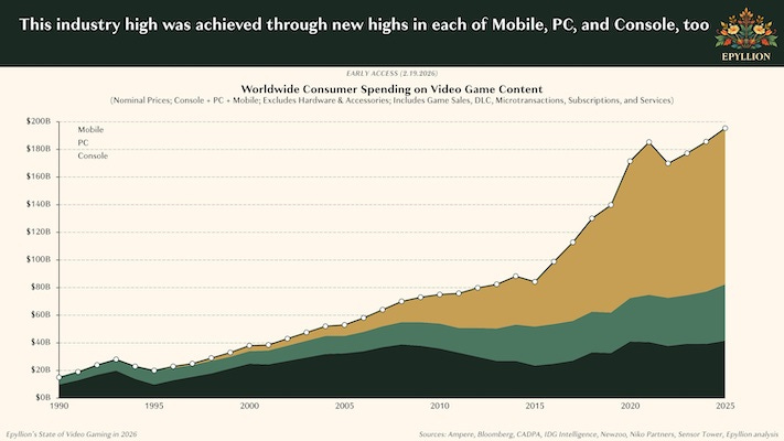 Chaque année, Matthew Ball fait un état des lieux du jeu vidéo. C’est passionnant, mais c’est surtout copieux avec plus de 160 pages de graphiques. Sans doute par masochisme, et à cause d’une curiosité trop développée, j’ai tout dévoré. Voici ce qu’il faut en retenir.