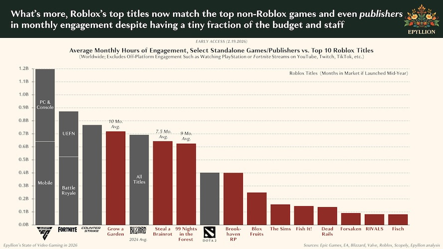 En termes d’heure de jeu par trimestre, Roblox fait mieux que Steam, PlayStation et Fortnite additionnés. Colossal. Certains jeux à l’esthétique très simple —ce qui reflète leur budget— concurrencent pas mal de AAA en terme de joueurs actifs mensuels.